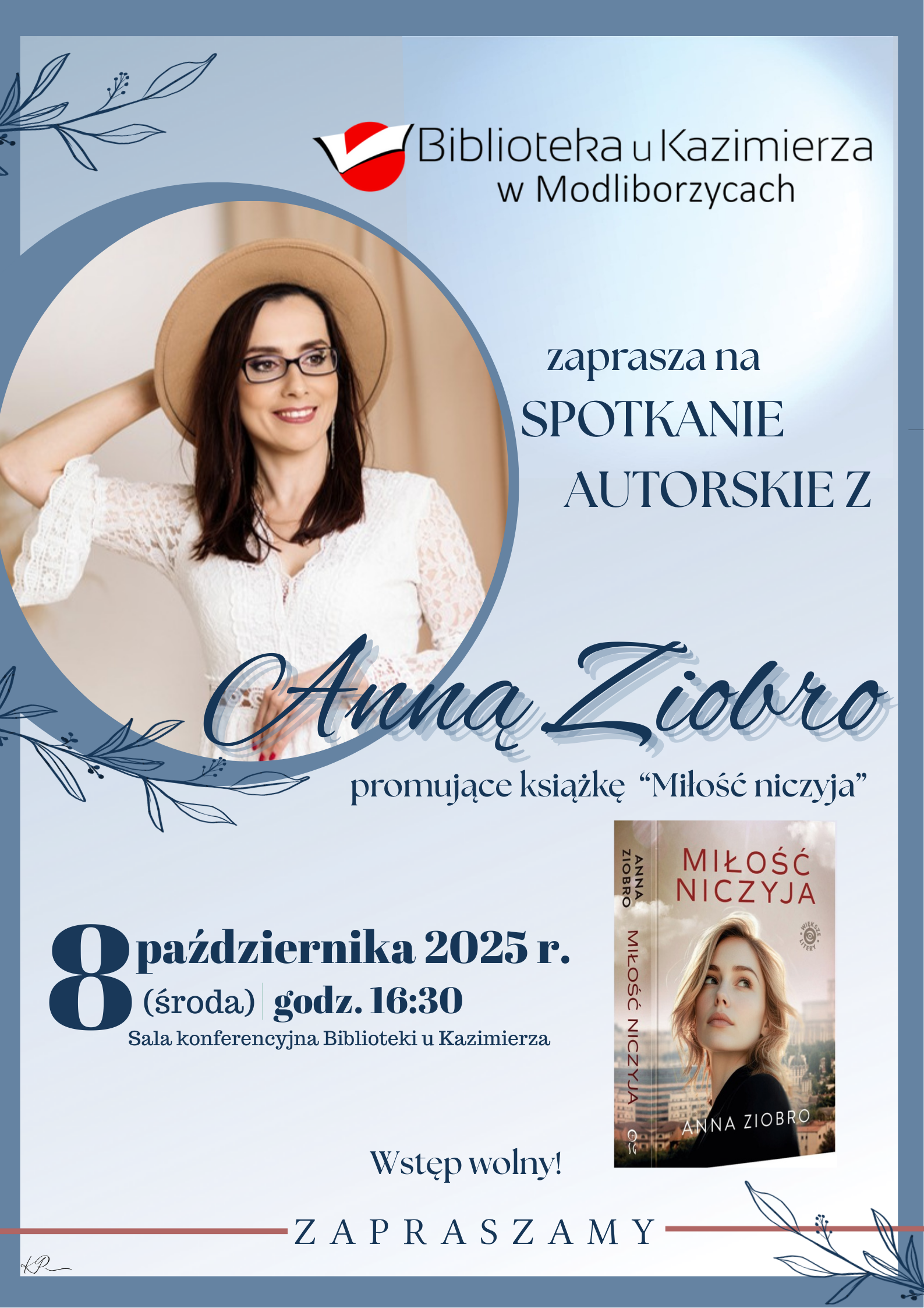 Biblioteka u Kazimierza serdecznie zaprasza wszystkich miłośników literatury na spotkanie autorskie z Anną Ziobro. Wydarzenie odbędzie się w środę, 8 października 2025 r. o godzinie 16:30 w sali konferencyjnej biblioteki.