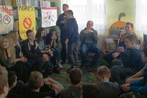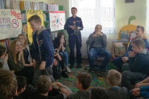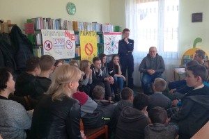 W spotkaniu brali udział uczniowie z ostatnich klas szkoły podstawowej i dwóch klas gimnazjum im. Jana Pawła II w Stojeszynie Pierwszym, a także nauczyciele. Najpierw Pani Alfreda Gierłach, bibliotekarka pracująca w Filii Bibliotecznej w Stojeszynie Pierwszym przedstawiła swoich gości, a następnie głos zabrała zaproszona policjantka. Pani Faustyna Łazur opowiedziała o aspektach i konsekwencjach prawnych uzależnienia od narkotyków. Wprowadziła obecnych na spotkaniu w świat przepisów prawnych, podjęła także temat odpowiedzialności prawnej i odpowiadaniu przed sądem za wykroczenia czy dokonane przestępstwa. Policjantka podkreśliła, jak ważna jest świadomość odpowiedzialności prawnej, a także poinformowała dzieci i młodzież, że już w wieku 17 lat młody człowiek odpowiada przed sądem za swoje czyny. Pani Faustyna wspomniała również o tym, że raz popełniony czyn czy wykroczenie zostaje w historii człowieka już na zawsze, akcentując przy tym jak niebezpieczne jest używanie substancji psychoaktywnych, które często prowadzi do popełniania czynów karalnych. Po wstępie pani Faustyny głos zabrał pan Łukasz Krzysztoń, który opowiedział więcej o samej specyfice uzależnienia od substancji psychoaktywnych. Wymienił konsekwencje zarówno biologiczne jak i psychologiczne, podając przy tym wiele przykładów ze swojej praktyki w pracy o ośrodku dla młodzieży w wieku od 13 do 18 lat w Cholewiance w Kazimierzu Dolnym. Pan Łukasz opowiedział także o coraz częściej występującym problemie używania „nowych” narkotyków, czyli dopalaczy. Psycholog wyraźnie zaakcentował jak szybko rozwija się uzależnienie w przypadku zażywania takich substancji i jak szybko pojawiają się skutki uboczne, często bardzo szkodliwe dla życia i zdrowia użytkownika. Po szczegółowym omówieniu konsekwencji wynikających z używania substancji psychoaktywnych nadszedł czas na pytania od uczestniczących w spotkaniu.